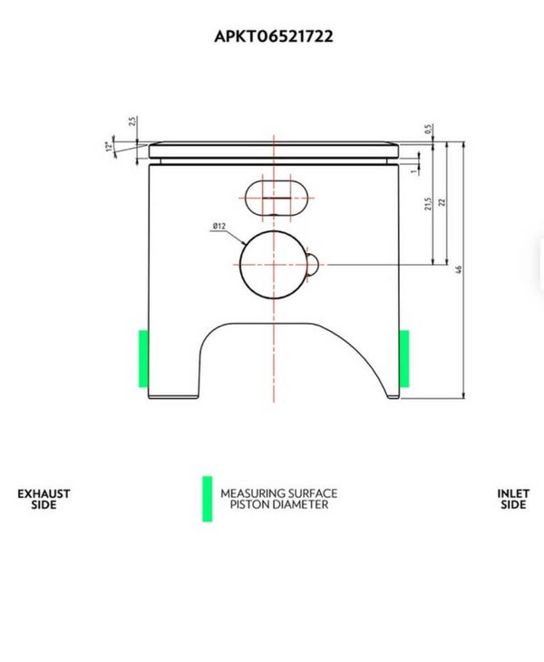 *Dieser Kolben benötigt ein Mindestspiel von 0,04 mm und ein Höchstspiel von 0,05 mm. IMMER DEN ZYLINDERDURCHMESSER PRÜFEN, einige neue SX65-Motoren haben einen Innendurchmesser von Ø45,03 und benötigen daher einen Kolben von Ø44,99. Muss in Kombination mit VHM 12°-Zylinderkopf und -Kopf verwendet werden.*